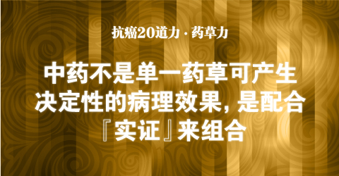 中药并不是单一药草就可产生决定性的病理效果,是配合『实证』来组合. 带津良一医师说,中药所产生的「相乘力」,可以发挥改善症状以及抗癌抑制作用的能量──这就是中医的特徵所在。
