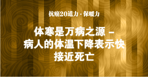 病人如果体温下降,代表快接近死亡的意思。我从出院到现在,已经十个年头了,这十年来,我也曾发生过好几次癌症复发和移转的危险。但我想能安度难关,除了是药草以及药食疗法发挥功效,温热我的身体外,重点是平常我也很留意不使自己身体感到寒冷,所以会利用携带型怀炉或者保温袋等保持身体暖和。